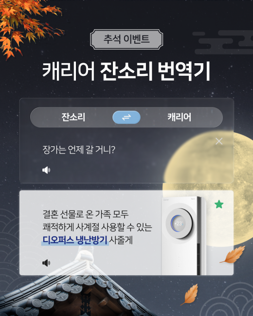 #EVENT 소중한 가족을 아끼고 걱정하는 마음이 더 쾌적하고 깨끗하게 전달될 수 있도록 캐리어 잔소리 번역기를 켜보세요! X 취업 했니? O 자소서 쓰느라 방에만 있을텐데 캐리어 공청기 사줄까? X 너 살이 좀 오른것 같다? O 땀 때문에 빨래도 자주 할텐데, 세탁기 캐치서비스 필요해? X 장가는 언제 갈거니? O 결혼선물로 온 가족 모두 쾌적하게 사계절...