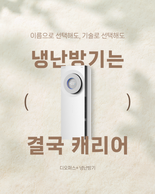 네 개의 계절, 하나의 솔루션 모든 계절을 품격 있고 쾌적하게 캐리어 디오퍼스+ 냉난방기 단순 풍량제어를 넘어 최적의 쾌적함을 제어하는 사계절 프리미엄 에어솔루션을 만나보세요! 세계 최초 18단 에어컨트롤이 나의 바람대로 스마트 AI솔루션으로 실내환경 맞춤형 자동운전 모든 공간에 녹아드는 품격 있는 디자인까지 지금 바로 디오퍼스+ 냉난방기로 격이 다른 쾌적...